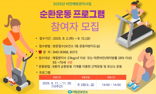 [아시아월드뉴스] 거창군은 9월 12일까지 비만예방관리사업의 일환으로 운영되는 ‘순환운동 프로그램’ 참여자 9명을 선착순 모집한다.