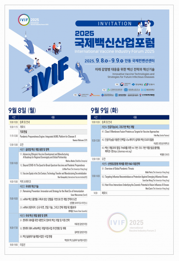 [아시아월드뉴스] 경상북도는 8일부터 9일까지 안동국제컨벤션센터에서 ‘미래 감염병 대응을 위한 백신 전략과 혁신기술’을 주제로 ‘2025 국제백신산업포럼’을 개최하고 세계적 백신 허브로 도약하는 기반을 다졌다.