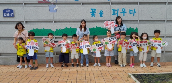 이날 행사에는 유아와 선생님 등 20여명이 참석했으며 체력단련실과 노인복지관·장애인복지관 로비 3곳에서 어르신과 이용객들에게 흡연의 해로움과 금연의 중요성에 대한 홍보활동을 진행했다.
