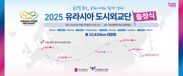 [아시아월드뉴스] 부산시와 부산글로벌도시재단은 ‘2025 유라시아 도시외교단’ 이 글로벌 허브도시 부산 브랜드를 홍보하고 자매·우호도시와 교류 협력하기 위해 오늘부터 9월 25일까지 총 16일간의 여정을 떠난다고 밝혔다.