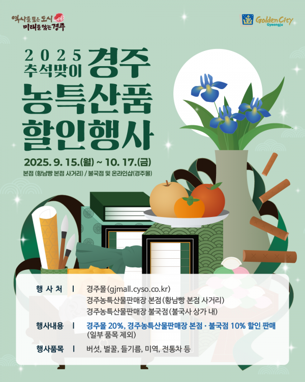 [아시아월드뉴스] 경주시는 2025 APEC 정상회의 성공개최를 기원하고 추석 명절을 맞아 9월 15일부터 10월 17일까지 ‘경주농특산물판매장 추석 특별할인행사’를 진행한다.