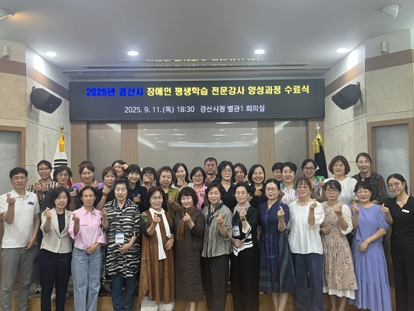 [아시아월드뉴스] 경산시는 11일 수강생과 관계자 등 40여명이 참석한 가운데 “2025년 장애인 평생학습 전문강사 양성과정”수료식을 가진 뒤 교육생에게 수료증을 전달했다고 밝혔다.