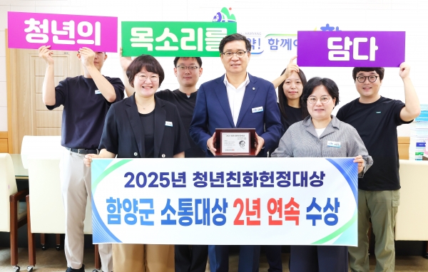 [아시아월드뉴스] 함양군은 지난 13일 서울 여의도 국회의원회관 대회의실에서 열린 ‘2025 제9회 대한민국 청년의 날 기념식’에서 ‘청년친화헌정대상 우수 기초자치단체부문 소통대상’을 수상하며 2년 연속 수상의 영예를 안았다.
