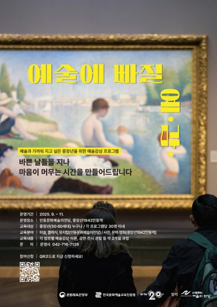 [아시아월드뉴스] 중장년층의 건강한 여가 생활과 문화 향유 기회 확대를 위해 안동문화예술의전당이 오는 9월 22일부터 중장년 여가 예술감상교육 프로그램 ‘2025 예술에 빠질 예.감.’을 진행한다.