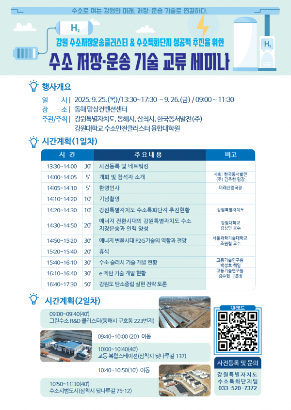 첫날 세미나에서는 △강원특별자치도 수소특화단지 추진 현황 △수소 저장·운송 및 인력 양성 전략 △에너지 전환 시대 P2G 기술의 역할과 전망 △수소 슬러시 및 e-메탄 기술 개발 현황 등이 발표된다.