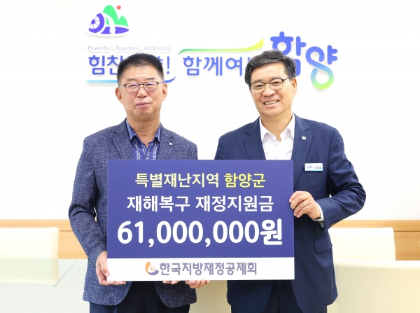 [아시아월드뉴스] 함양군은 22일 행정안전부 산하 지방재정 전문기관인 한국지방재정공제회로부터 특별재난지역 재해복구 재정지원금 6,100만원을 전달받았다.