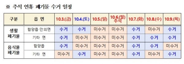 생활 쓰레기 수거 일정은 △3일 전 읍면 △4일 함양읍·안의면 △7일 전 읍면 △8일 함양읍·안의면 외 기타 면 △9일 전 읍면에서 정상 수거한다.