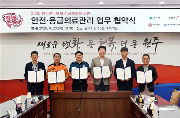 [아시아월드뉴스] 원주시는 ‘2025 원주만두축제’의 안전하고 성공적인 개최를 위해 지난 23일 원주경찰서 원주소방서 원주세브란스기독병원, 성지병원과 함께 안전·응급의료관리 업무협약을 체결했다.