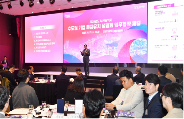 [아시아월드뉴스] 부산시는 오늘 오전 11시, 서울 여의도 콘래드호텔에서 수도권 기업 대상으로 부산의 투자환경과 투자 특전을 설명하는 '수도권 투자유치 설명회'를 개최한다고 밝혔다.