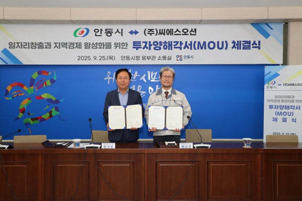 [아시아월드뉴스] 안동시와 ㈜씨에스오션은 9월 25일 안동시청 소통실에서 160억원 규모의 유리섬유 철근 대체재 공장 신설을 위한 투자 양해각서를 체결했다.