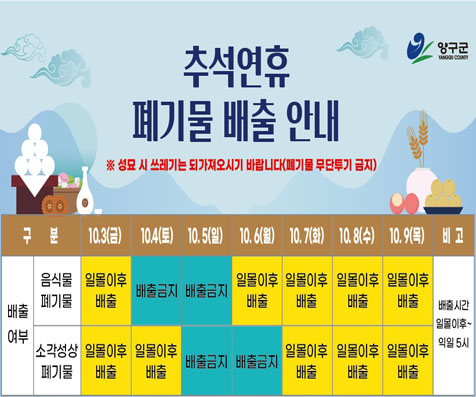 양구군은 연휴 기간 쓰레기 수거 일정을 사전 홍보하고 포장지, 택배 상자 등 올바른 분리배출 방법과 1회용품 줄이기 등을 적극 홍보해 생활 쓰레기로 군민들이 불편을 겪지 않도록 할 방침이다.