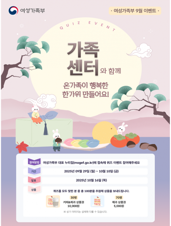 한편 여성가족부 대표 누리집에서는 추석을 계기로 ‘가족센터 초성 퀴즈’ 행사를 진행한다.