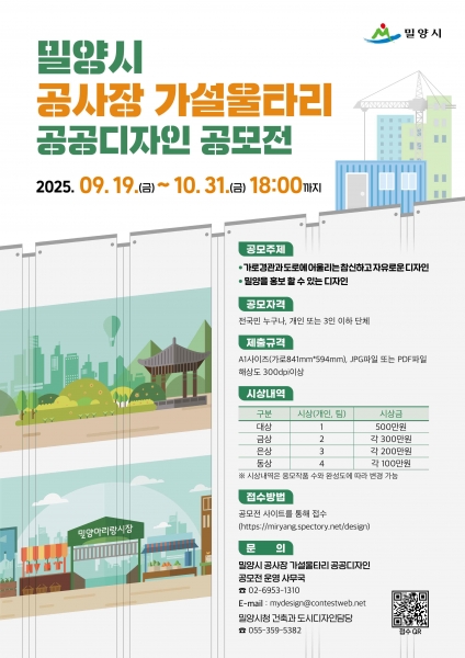 이번 공모전의 주제는 △밀양시 가로경관과 도로에 어울리는 참신하고 자유로운 디자인 △밀양을 홍보할 수 있는 디자인으로 선정된 수상작은 상금과 함께 실제 건설 현장에 설치돼 시민들에게 공개된다.