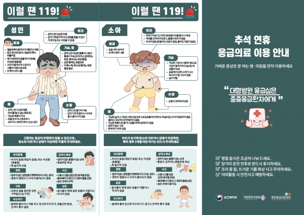한편 보건복지부와 지방자치단체는 추석 연휴 기간 동안 응급의료체계 공백 없이 운영될 수 있도록 응급진료상황실을 운영할 계획이며 문 여는 병·의원과 약국 운영상황을 점검한다.