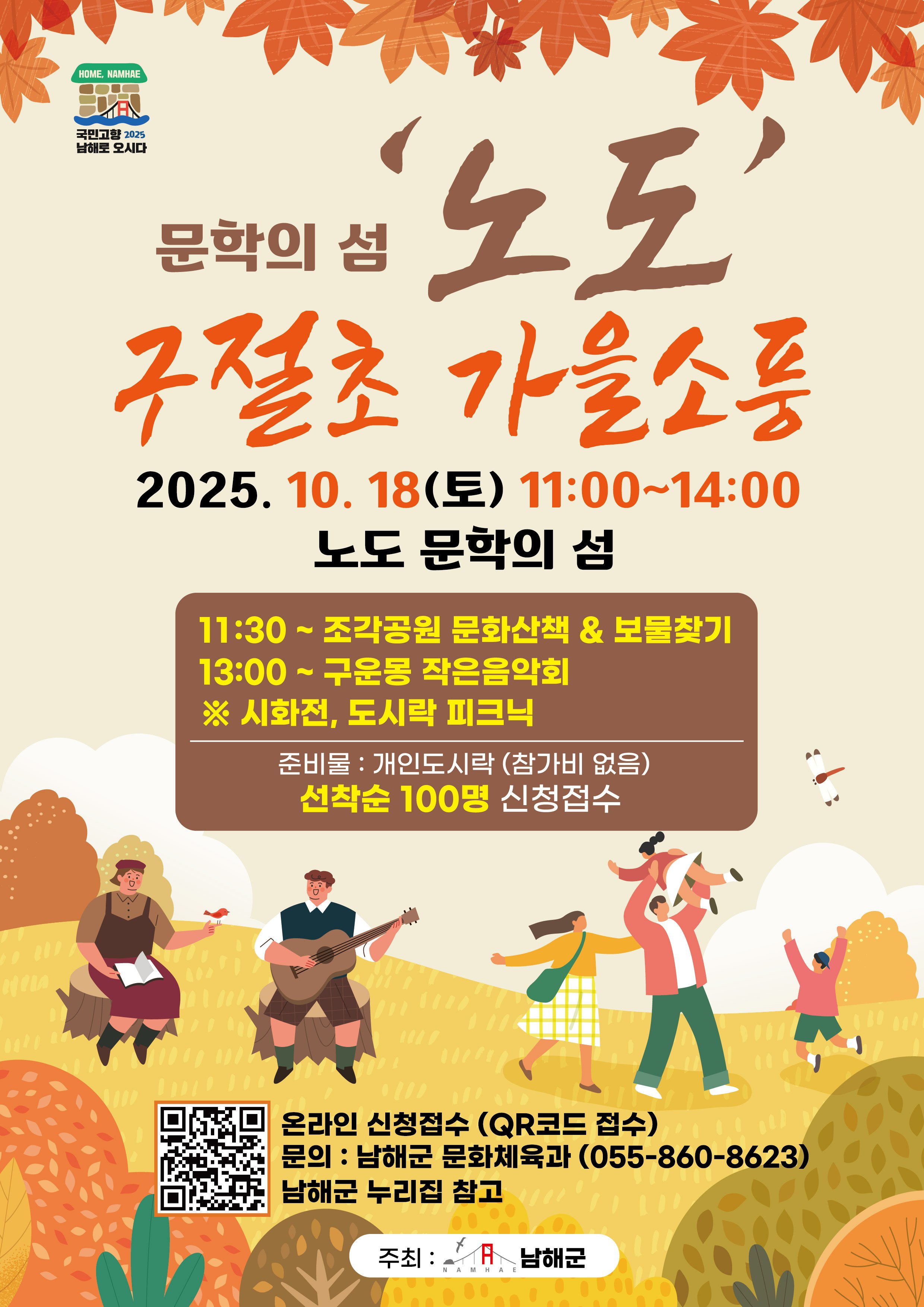 김지영 남해군 문화체육과장은 “노도 구절초 가을소풍은 문학과 자연, 음악이 어우러진 소박하지만 특별한 축제”라며, “많은 군민과 관광객이 함께해 가을의 낭만을 즐기길 바란다”라고 밝혔다.