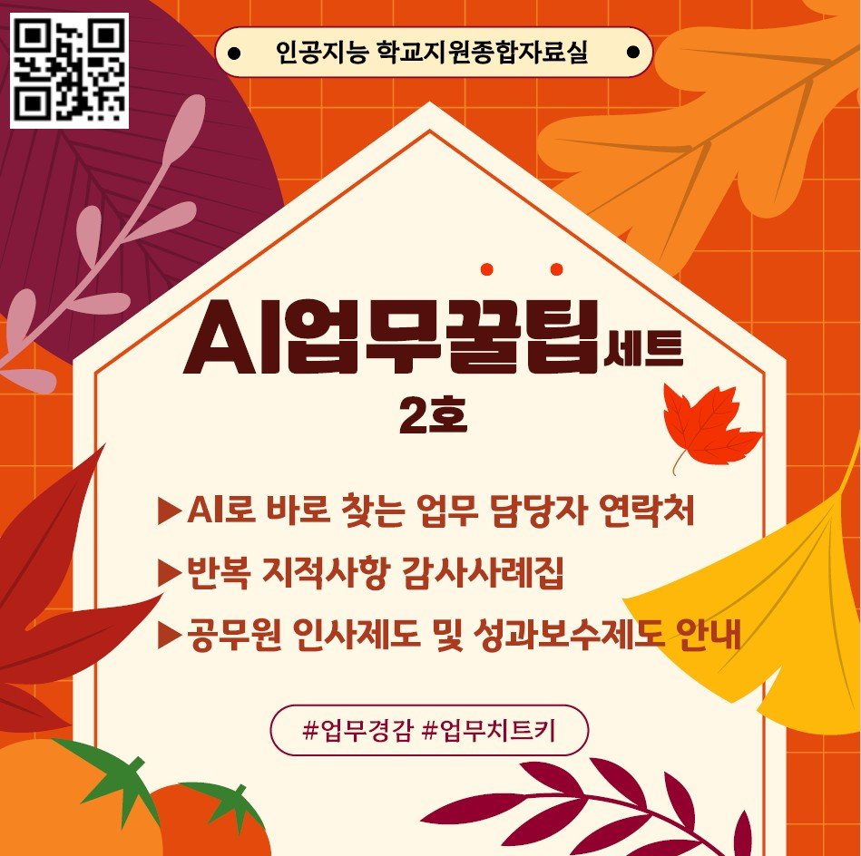 이번에 공개된 AI 업무꿀팁세트 2호는 교육 현장에서 자주 문의 되는 행정 절차와 반복적으로 발생하는 오류를 예방하기 위한 실무형 지원 자료로 구성됐다.