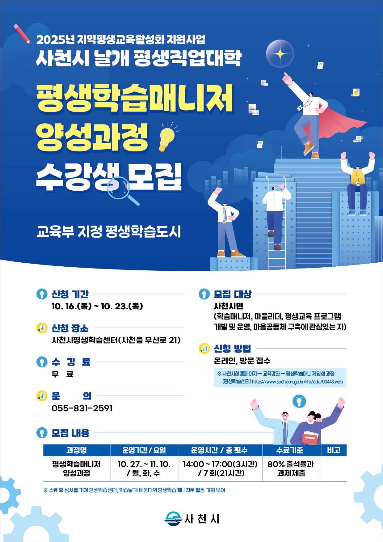 [아시아월드뉴스] 사천시는 10월 16일부터 10월 23일까지 2025년 지역평생교육활성화 사업 중 ‘평생학습매니저 양성과정’ 수강생을 모집한다고 13일 밝혔다.