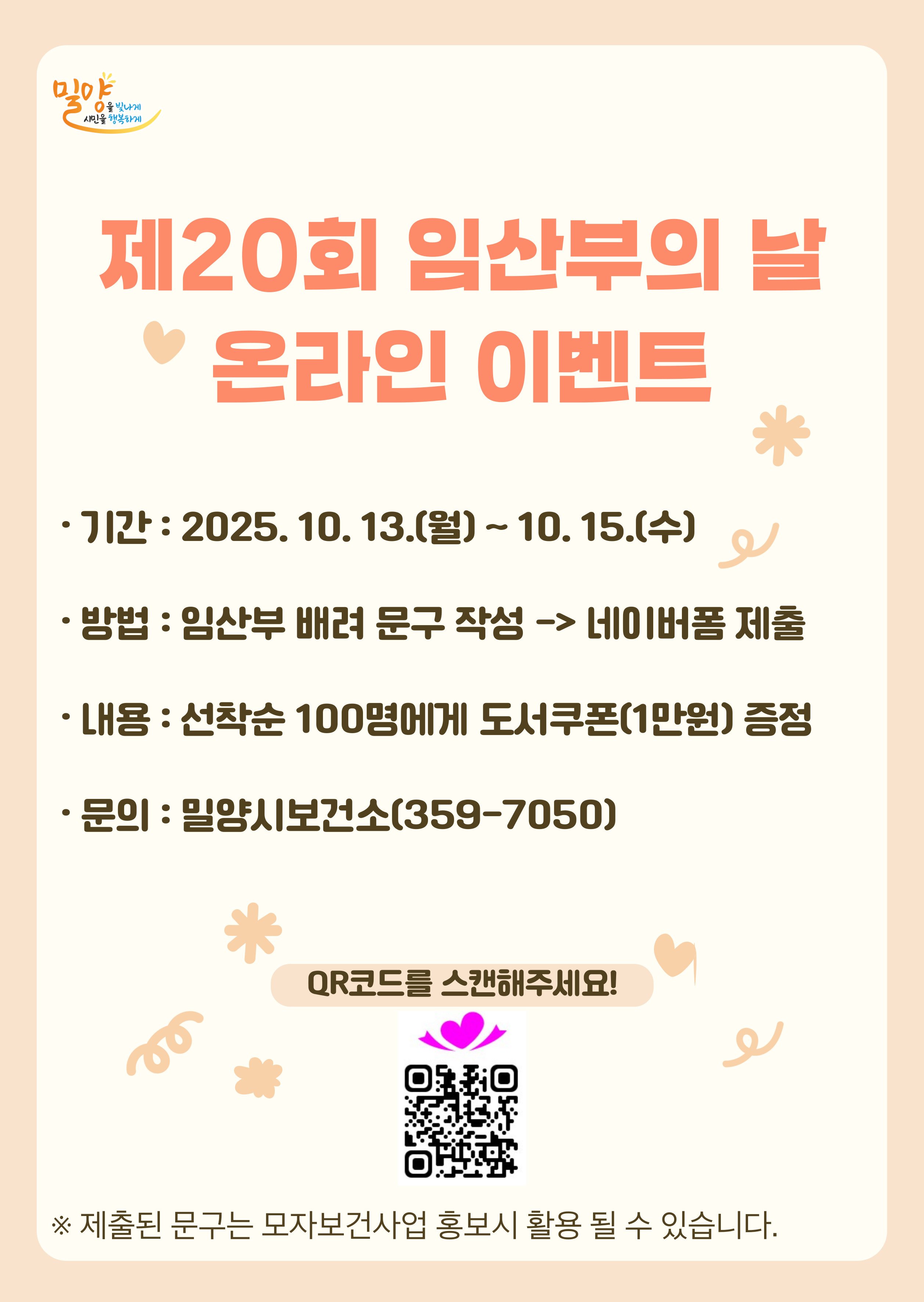 [아시아월드뉴스] 경남 밀양시(시장 안병구)는 제20회 임산부의 날을 맞아 13일부터 15일까지 3일간 온라인 이벤트를 진행한다고 밝혔다.