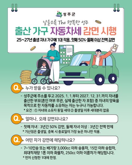 [아시아월드뉴스] 성주군은 13일 올해를 포함해 2027년까지 자녀를 출산한 가구를 대상으로 자동차세를 50%(둘째 자녀 이상 전액) 감면한다고 밝혔다.