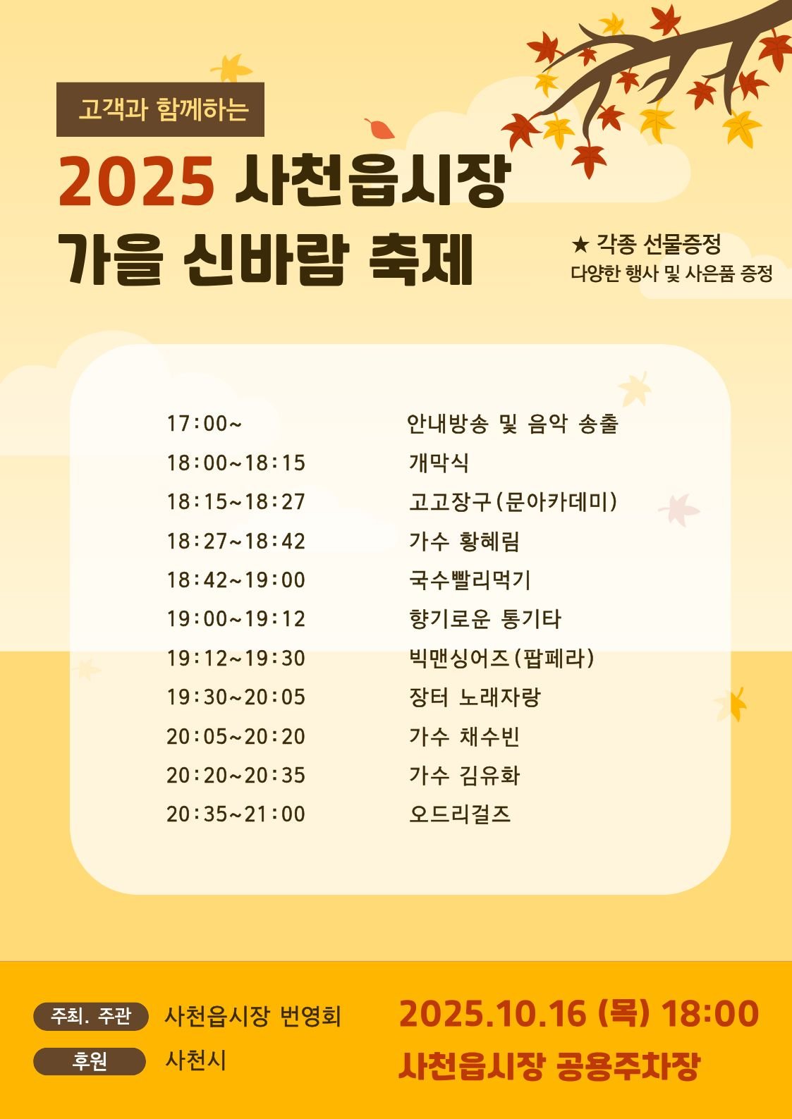 또한, 사천읍시장의 대표 먹거리인 국수를 소재로 한 국수 빨리 먹기 대회, 장터 노래자랑 등 시민이 직접 참여할 수 있는 다양한 체험행사도 마련된다.