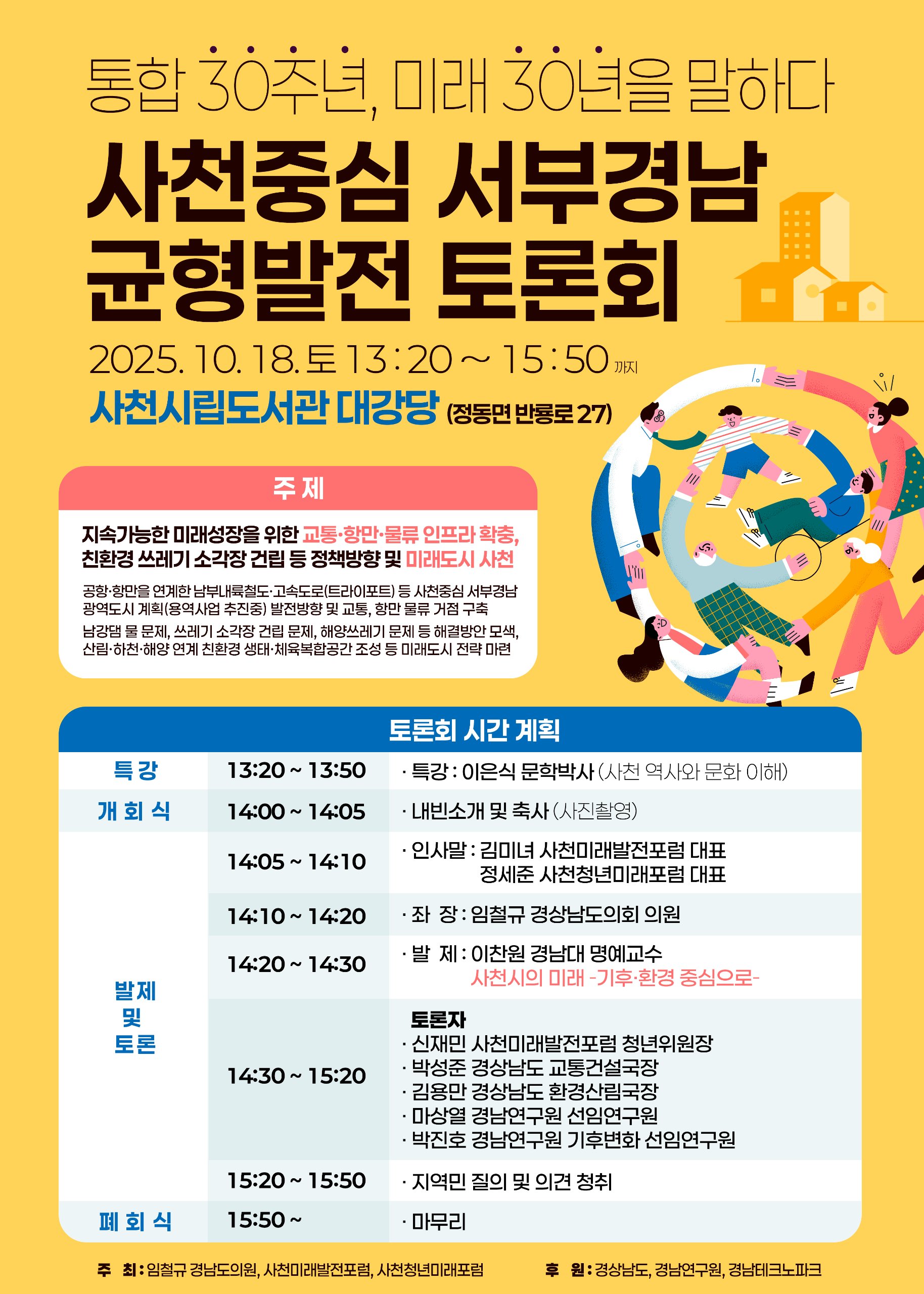이번 토론회는 사천시 통합 30주년을 뒤돌아 보고 미래 30년의 사천을 설계하는 시간으로 임철규 경상남도의원이 주도하고 사천미래발전포럼과 사천청년미래포럼이 공동 주최- 주관한다.