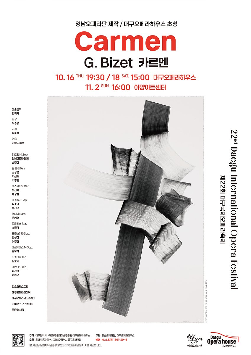 [아시아월드뉴스] (재)대구문화예술진흥원 대구오페라하우스는 문화체육관광부 '2025 지역대표예술단체 육성지원사업' 선정된 영남오페라단의 오페라 ‘카르멘’을 제22회 대구국제오페라축제의 메인 프로그램으로 초청해 오는 10월 16일(목), 18일(토), 11월 2일(일)에 개최한다.