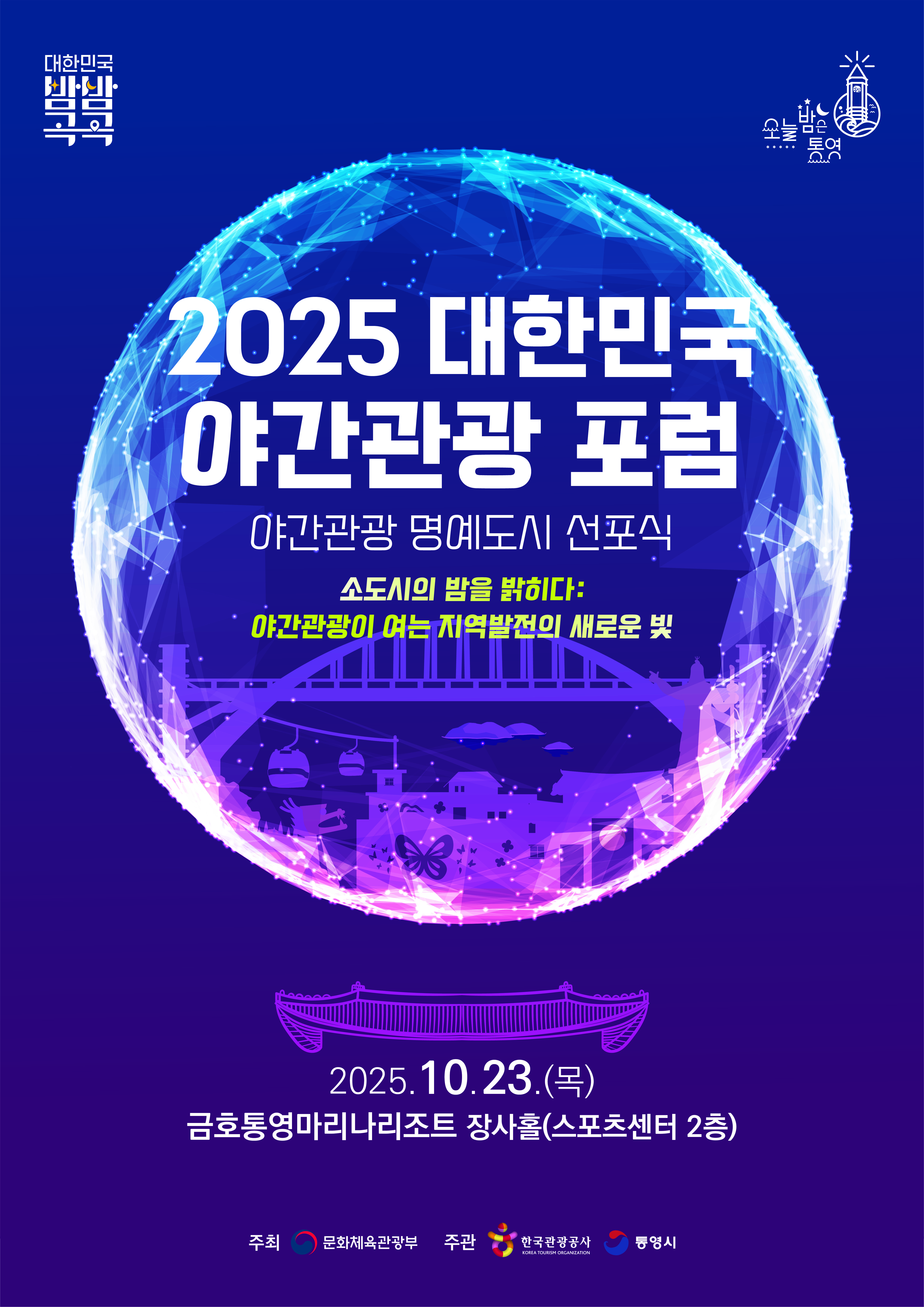 [아시아월드뉴스] 통영시(시장 천영기)는 오는 23일(목) 통영 금호마리나리조트에서 문화체육관광부가 주최하고 한국관광공사와 통영시가 공동으로 주관하는 ‘2025 대한민국 야간관광 포럼 및 야간관광 명예도시 선포식’을 개최한다.