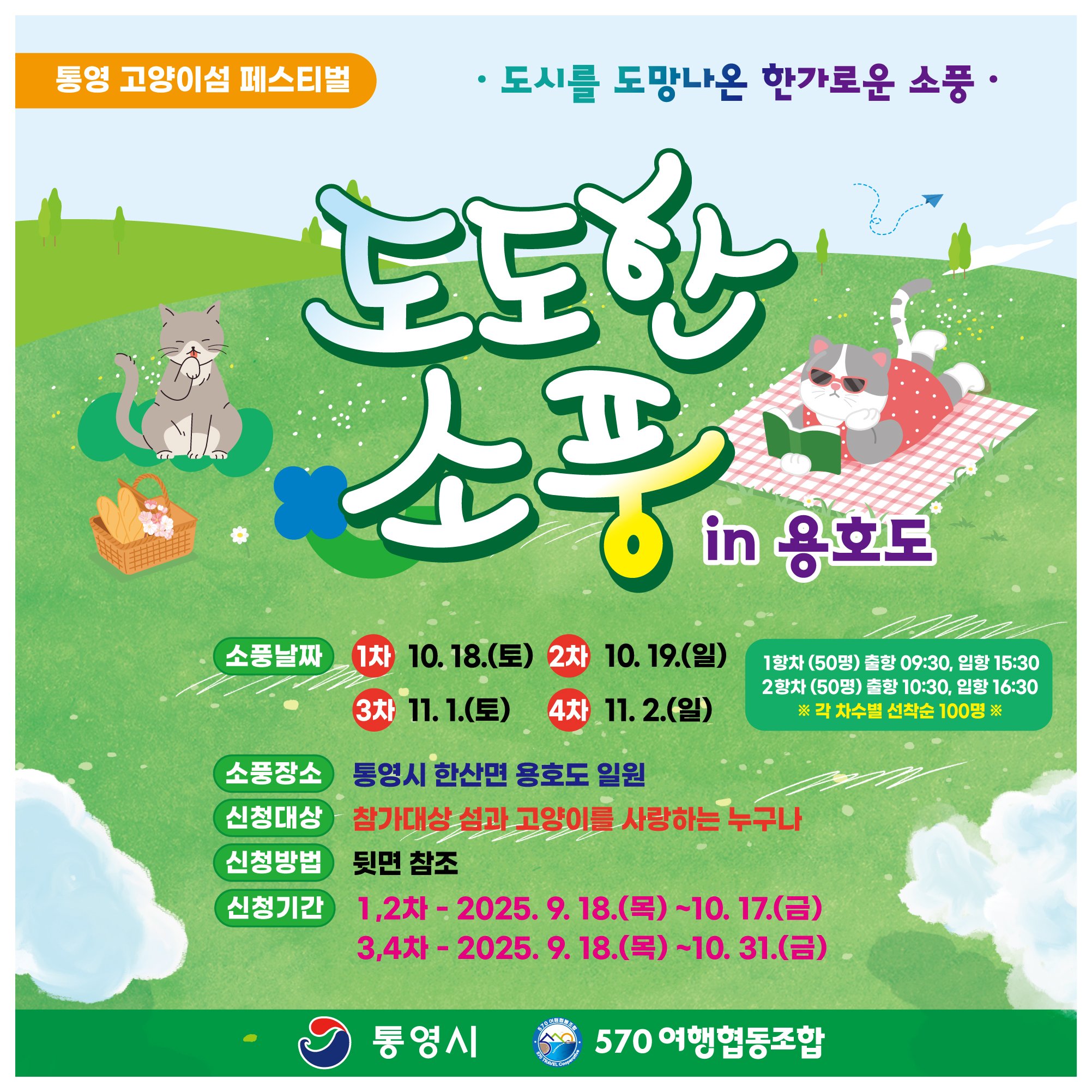 시 관계자는 “용호도는 고양이와 사람이 함께 살아가는 공존의 섬으로 변화하고 있으며 ‘도도한 소풍 in 용호도’행사를 통해 많은 분들이 가을 정취 속 고양이와 함께 섬마을의 여유로운 일상과 프로그램을 경험하길 바란다”고 많은 관심과 참여를 요청했다.