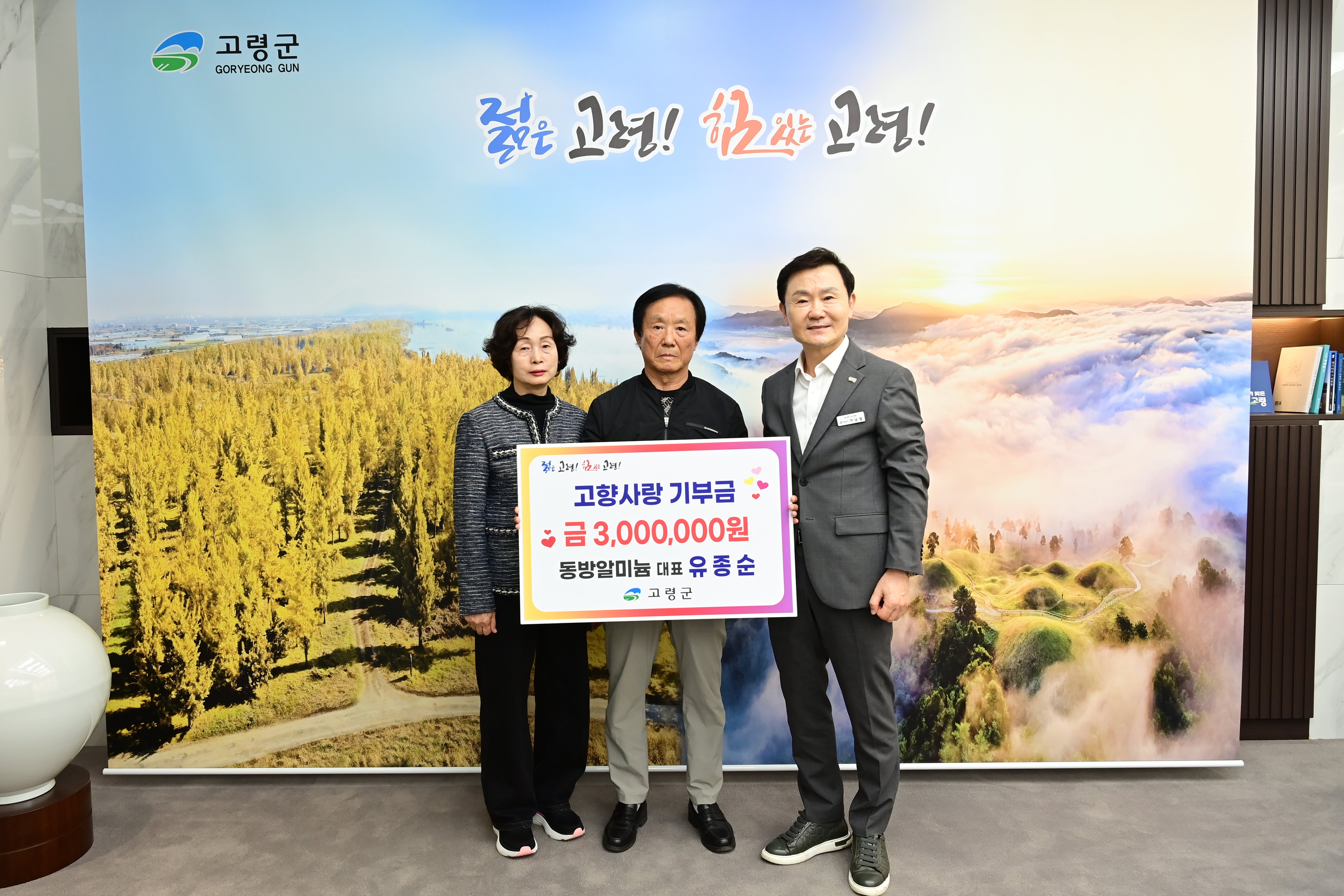 [아시아월드뉴스] 고령군(군수 이남철)은 동방알미늄 유종순 대표가 지난 13일 고령군청을 방문해 2년 연속 고향사랑기부금 300만원을 기탁하며 고령군 지역발전에 힘을 보탰다고 전했다.