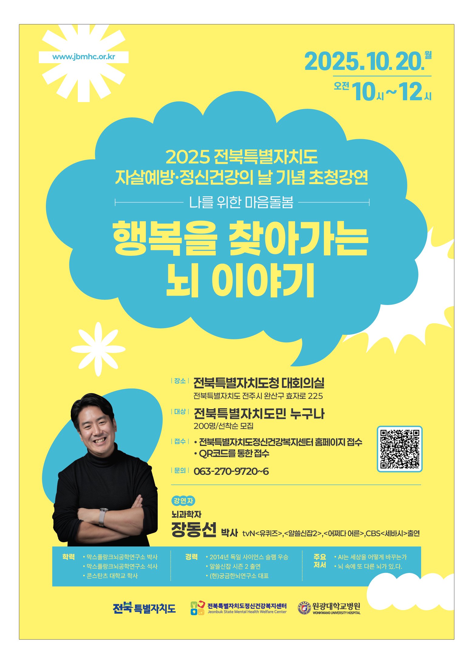[아시아월드뉴스] 전북도, 자살예방의 날- 정신건강의 날 기념 도민 강연 마련 “행복을 찾아가는 뇌 이야기”뇌과학자 장동선 박사 초청 마음건강과 생명존중의 가치, 도민과 함께 나누는 자리 전북특별자치도가 자살예방의 날(9월 10일)과 정신건강의 날(10월 10일)을 기념해 오는 10월 20일(월) 오전 10시, 도청 4층 대회의실에서 도민과 유관기관 종사자 300여명이 참여하는 ‘나를 위한 마음돌봄 특별강연’을 연다.