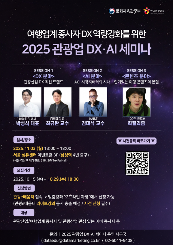 [아시아월드뉴스] 문화체육관광부와 한국관광공사는 관광산업 종사자의 디지털전환, 인공지능과 연계한 역량 강화를 위해 11월 3일 서울 섬유센터 이벤트홀에서 ‘관광업 DX·AI 세미나’를 개최한다.