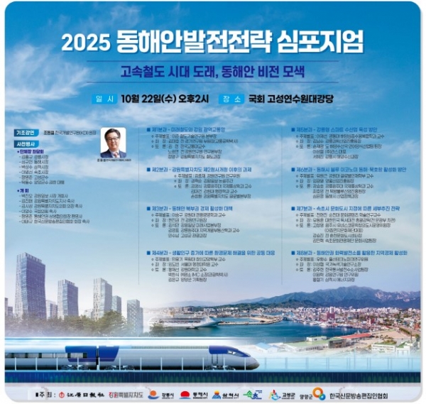 이번 심포지엄은 동해고속철도 개통을 앞두고 동해안을 중심으로 한 광역권 발전 비전과 시군간 상생 전략을 모색하는 자리로 동해시 부시장을 비롯해 동해안권 6개 시·군 대표와 관계자, 분야별 전문가가 참석할 예정이다.