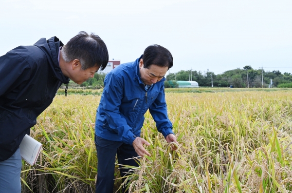 [아시아월드뉴스] 성낙인 창녕군수가 21일 본격적인 수확기를 맞아 벼 수확이 지연되고 있는 현장을 찾아 농민들을 위로하고 관계 부서에 영농지도를 당부했다.