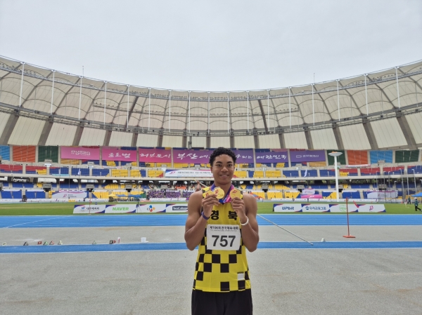 [아시아월드뉴스] 예천군 육상 직장운동경기부 나마디 조엘 진 선수가 제106회 전국체전에서 ‘스프린터 더블’에 이어 400m 계주에서도 금메달을 획득하며 3관왕을 달성했다.