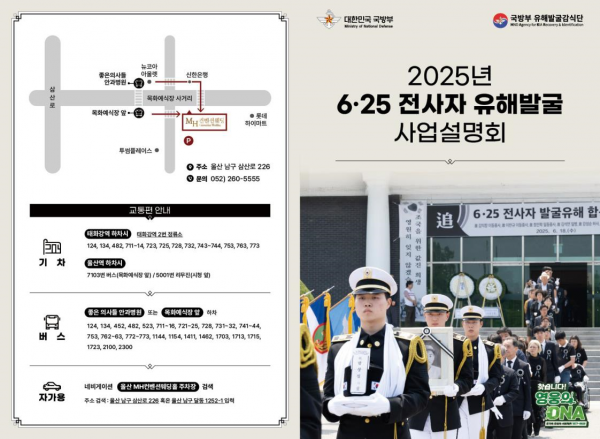 [아시아월드뉴스] 국방부유해발굴감식단은 10월 22일 울산광역시 남구에서 2025년 하반기 6·25전사자 유해발굴사업 설명회를 개최했다.