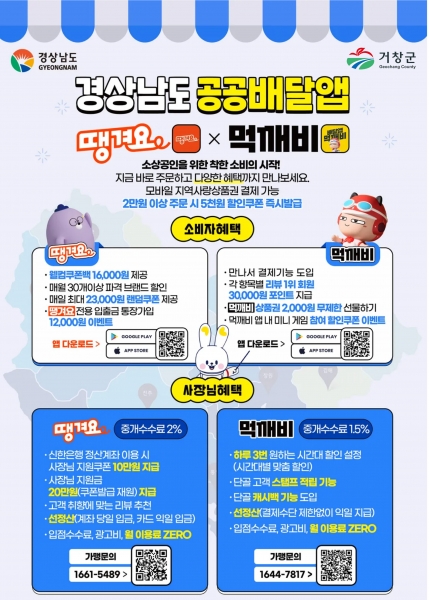 [아시아월드뉴스] 거창군은 경상남도 광역형 공공배달앱 서비스인 ‘땡겨요’ 와 ‘먹깨비’ 가 10월부터 본격 운영되어 소상공인들로부터 호응을 받고 있다고 23일 밝혔다.