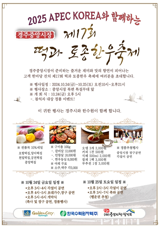 이번 행사는 ‘2025 APEC KOREA와 함께하는 경주 중앙시장 축제’로 상인들의 정성과 열정을 담아 17년째 이어지고 있다.