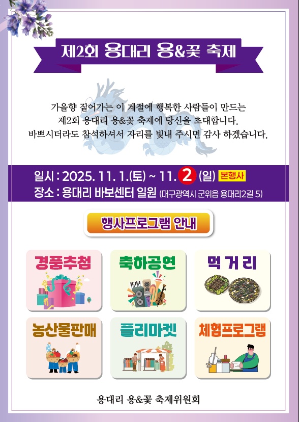 “행정이 주도하기보다 주민이 스스로 기획하고 실행하는 과정에서 마을의 변화와 활력이 시작된다”며 “이러한 축제들이 군민의 자긍심을 높이고 군위 전체로 확산되어 행복한 군위, 활력 있는 농촌으로 나아가는 밑거름이 되길 기대한다”고 덧붙였다.
