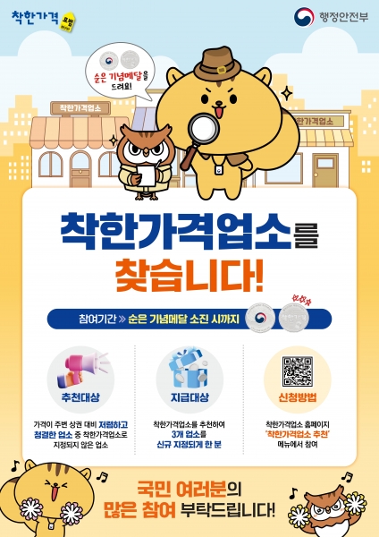 착한가격업소 지정은 행정안전부 선정 기준에 따라 가격수준과 위생·청결 상태 등을 현장 점검해 결정한다.