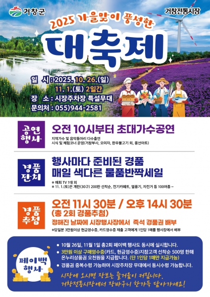 특히 행사 당일 거창전통시장에서 3만원 이상 물건을 구입한 고객을 대상으로 시장주차장 특설무대에서 TV, 자전거 등 100여 종의 경품 추첨 행사를 진행하며 온누리 상품권을 지급하는 환급 행사도 함께 운영해 소비자의 혜택을 확대할 계획이다.