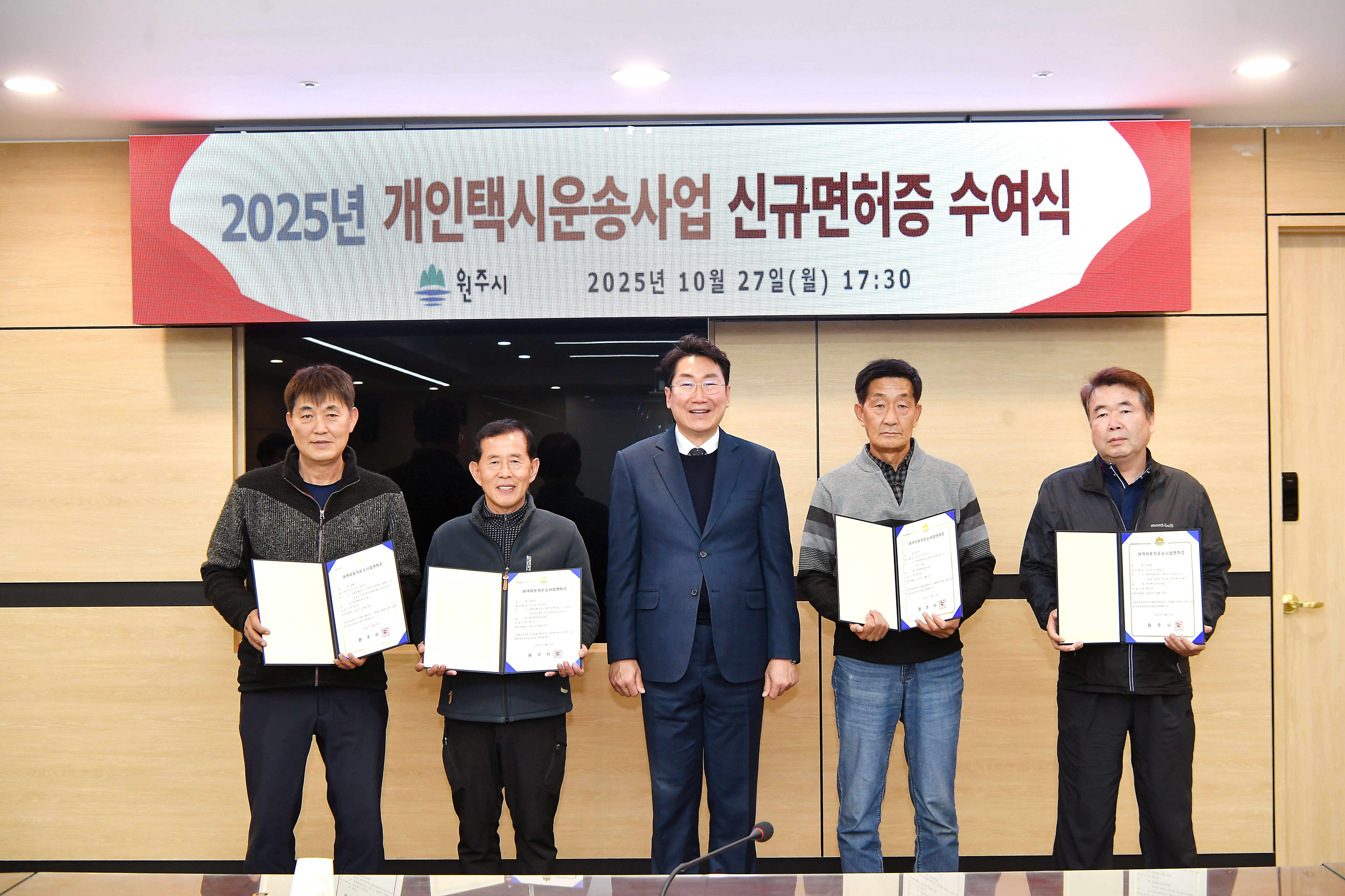 [아시아월드뉴스] 원주시는 2025년 개인택시운송사업 신규 면허 대상자 4명을 확정· 발표하고 이달 27일 시청 7층 회의실에서 개인택시 운송사업 신규 면허증 수여식을 개최했다.