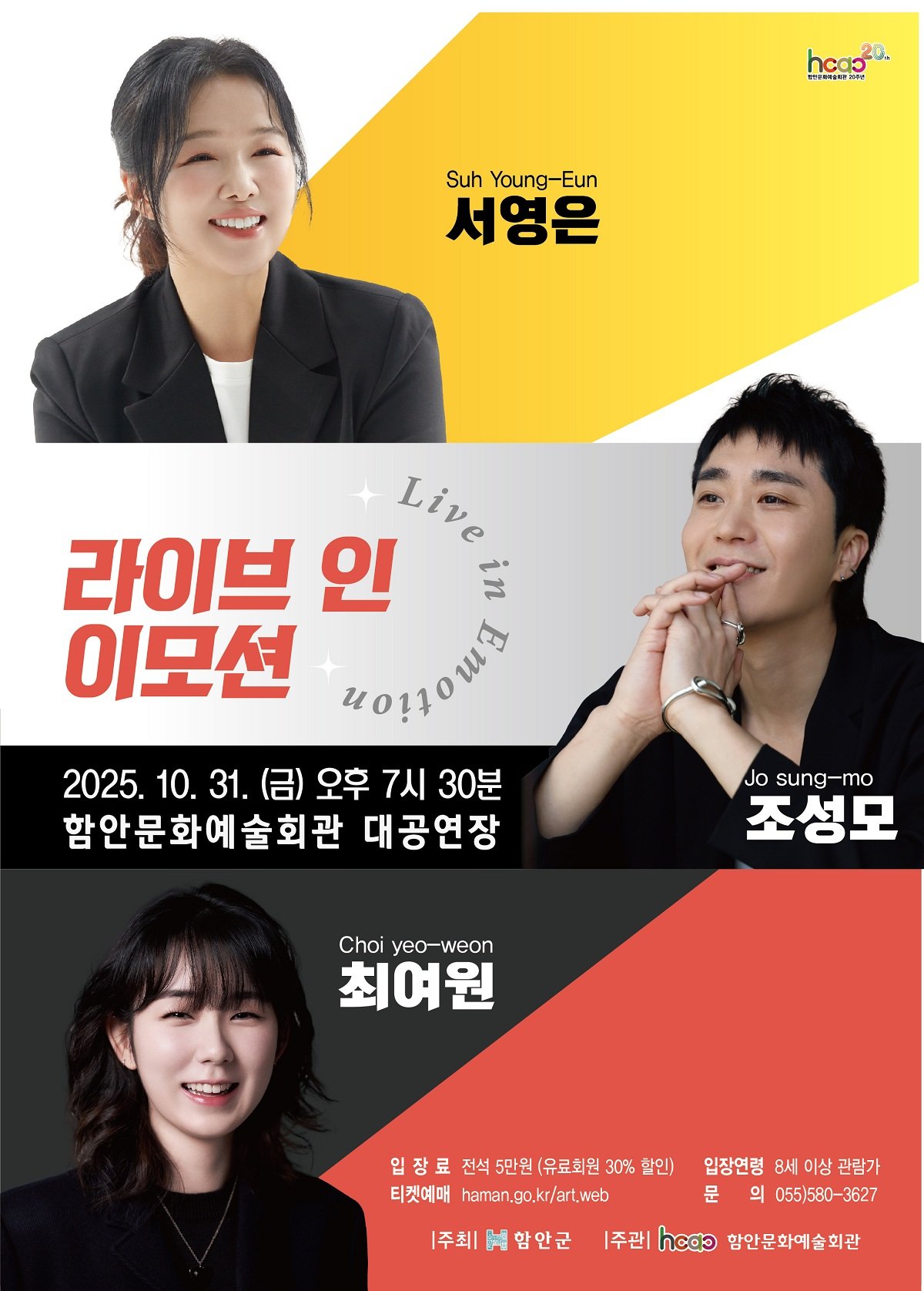[아시아월드뉴스] 함안군은 조성모·서영은·최여원이 함께하는 ‘라이브 인 이모션(Live in Emotion)’콘서트가 오는 10월 31일 오후 7시 30분 함안 문화예술회관 대공연장에서 개최된다고 밝혔다.