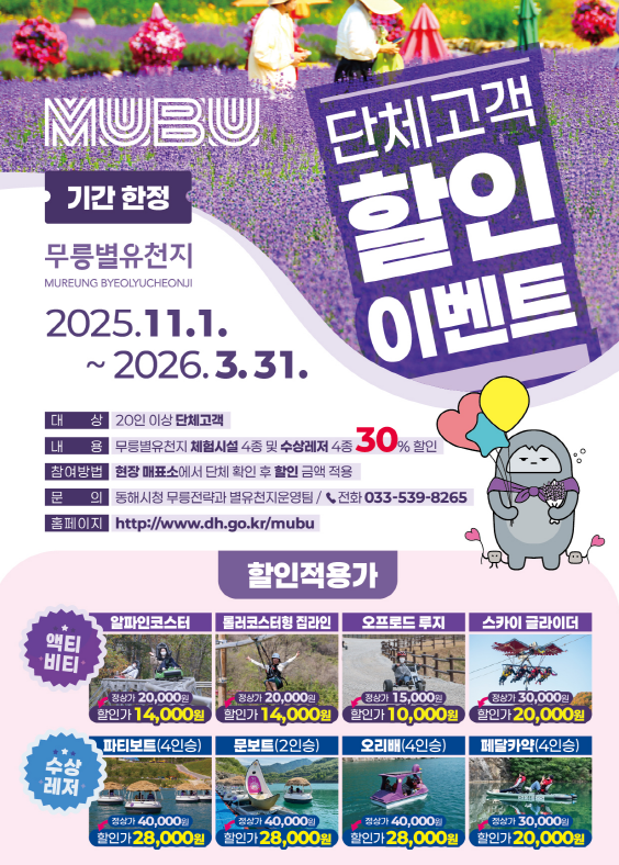 [아시아월드뉴스] 동해시는 무릉별유천지의 이용 활성화와 지역경제 활력을 높이기 위해 오는 11월 1일부터 2026년 3월 31일까지 4개월간 ‘비수기 체험시설 이용료 할인 이벤트’를 추진한다고 밝혔다.