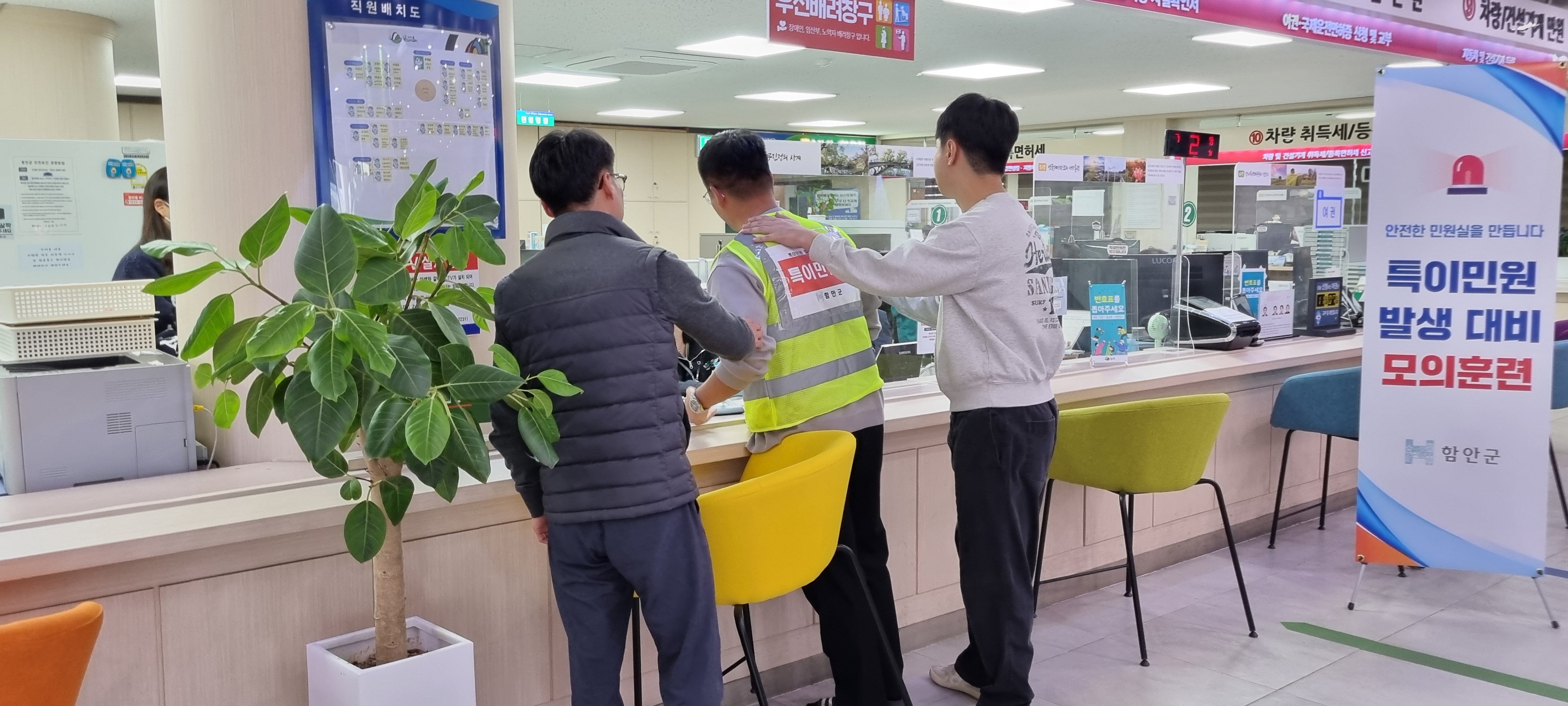 [아시아월드뉴스] 함안군은 지난 10월 30일 군청 민원실에서 안전한 근무환경 조성을 위해 함안경찰서 가야지구대와 합동으로 특이 민원 발생을 대비해 모의훈련을 실시했다고 밝혔다.