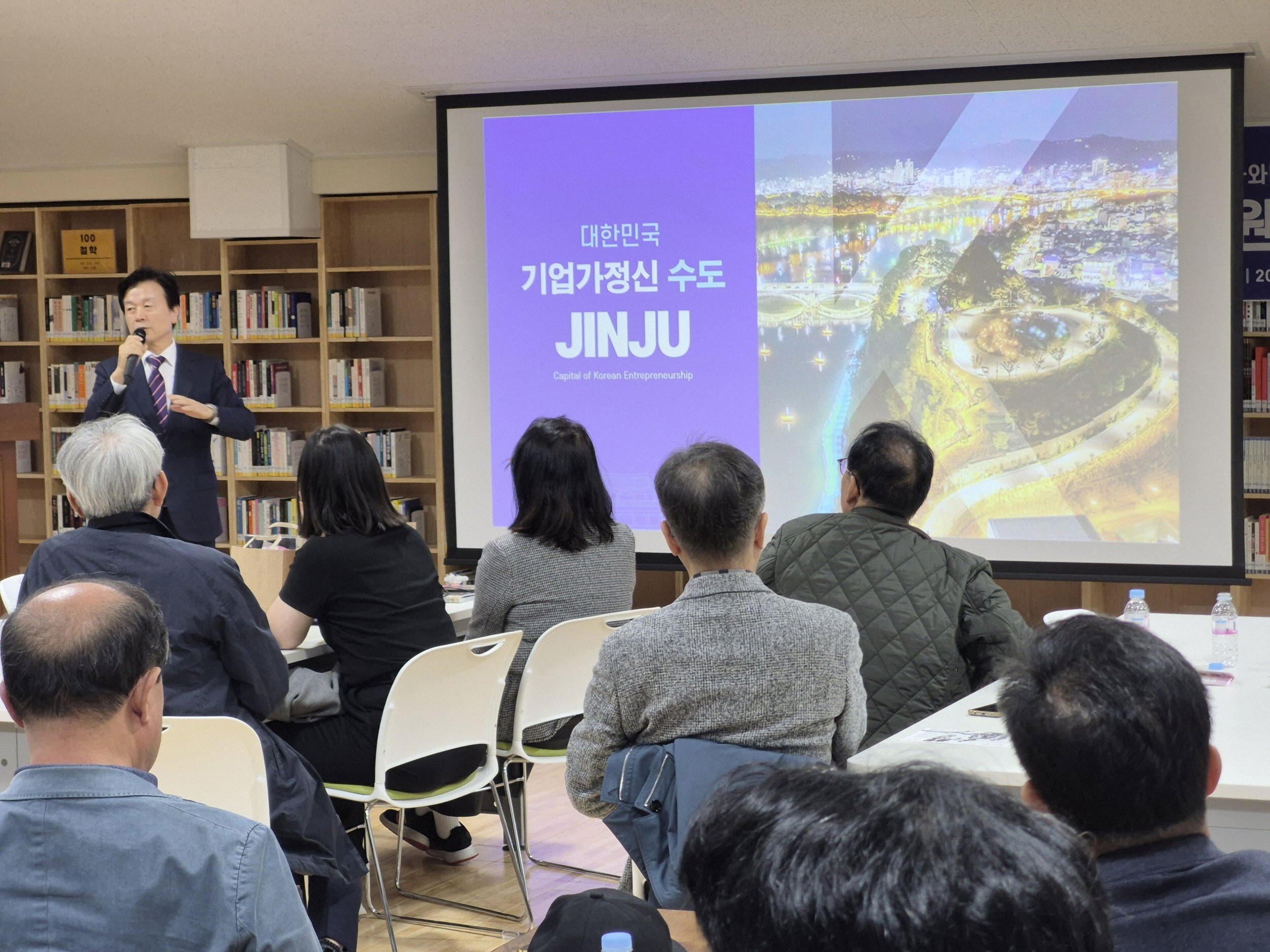 이어 “지난 10월 26일부터 28일까지 개최된 진주 K-기업가정신 국제포럼에 연사로 참석한 세계적 석학들이 진주 K-기업가정신은 인간성과 공동체, 창의성을 중심에 둔 혁신 모델로서 세계가 주목해야 할 가치라고 평가하며 ‘진주 선언’을 채택했다”며 “진주시는 이러한 가치를 세계로 확산하기 위해 진주 K-기업가정신센터 건립·운영, 진주 K-기업가정신 국제포럼과 청년포럼, 대한민국 기업가정신관 건립, K-거상 관광 루트 상품화 사업, 초중고 진주 K-기업가정신 교육 등 다양한 노력을 기울이고 있다”고 말하며 진주 K-기업가정신이 대한민국을 대표하는 K-콘텐츠로 자리매김할 수 있도록 재단법인 대한민국역사와미래에서 적극적으로 홍보해 줄 것을 당부했다.