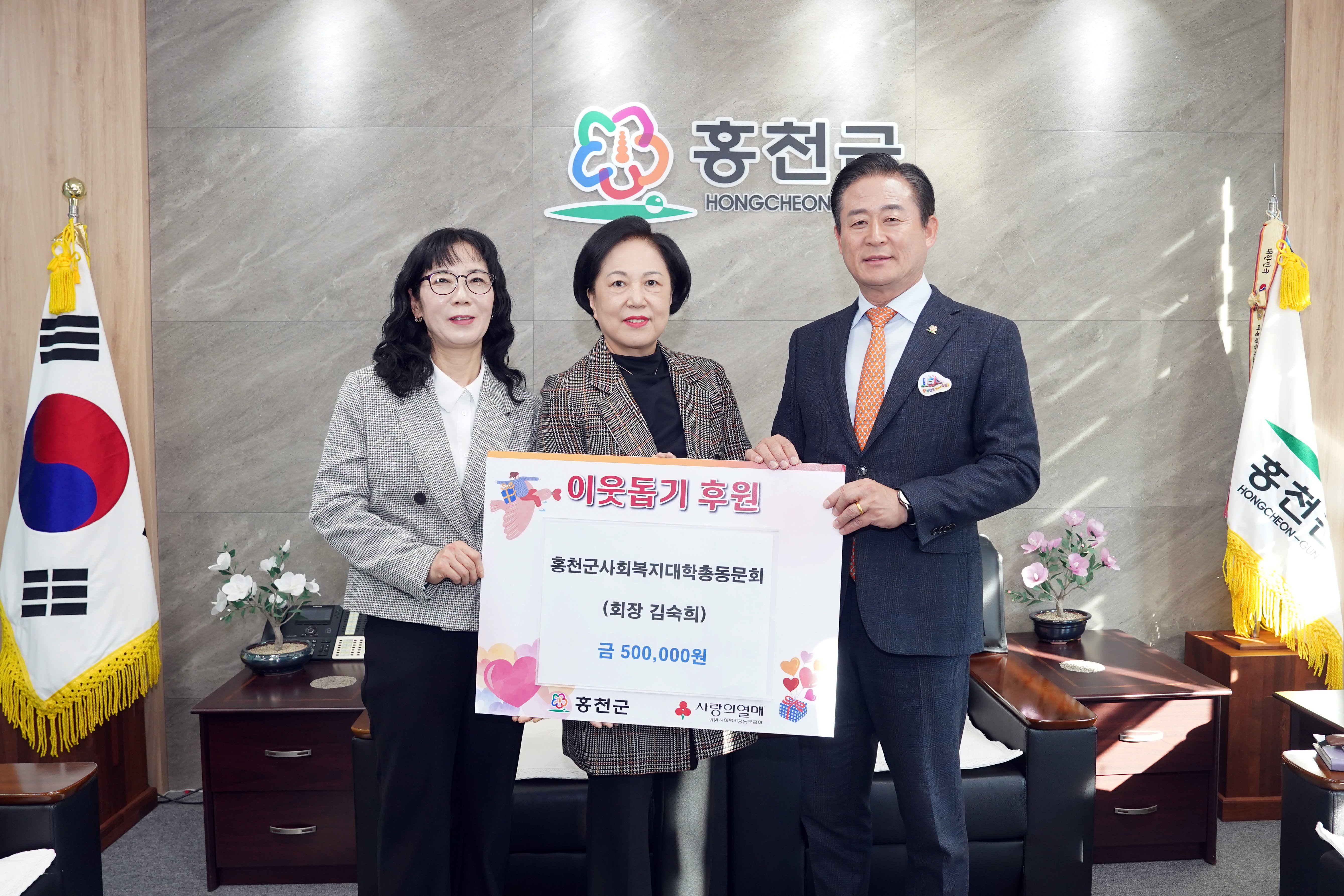 [아시아월드뉴스] 홍천군사회복지대학총동문회는 11월 3일 홍천군청을 방문해 어려운 이웃돕기 성금 50만원을 기탁했다.