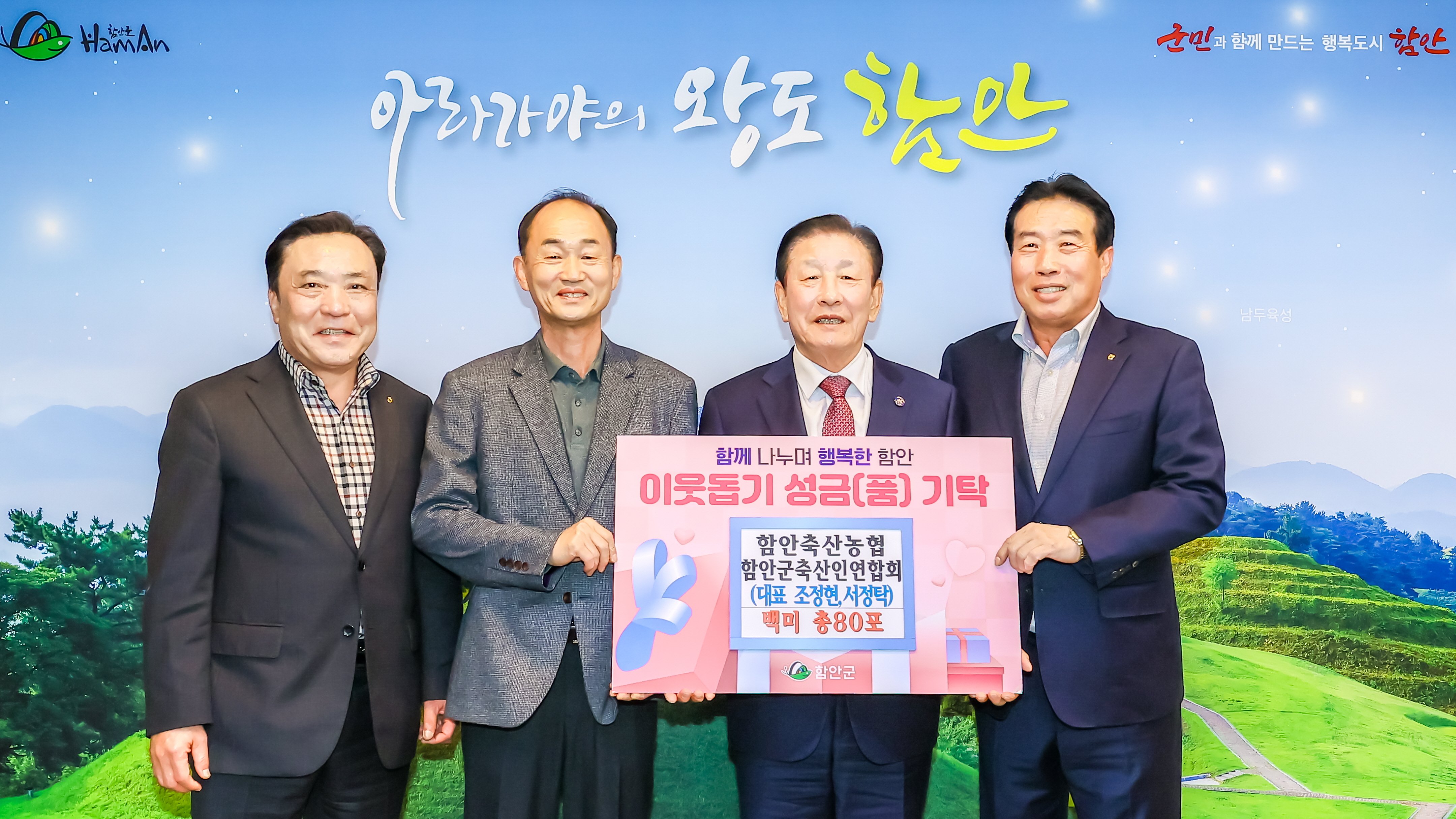 [아시아월드뉴스] 함안군은 지난 3일 함안축산농협(조합장 조정현)과 함안군축산인연합회(회장 서정탁)가 어려운 이웃을 돕기 위해 백미 80포(10kg 70포, 4kg 10포)를 기탁했다고 밝혔다.