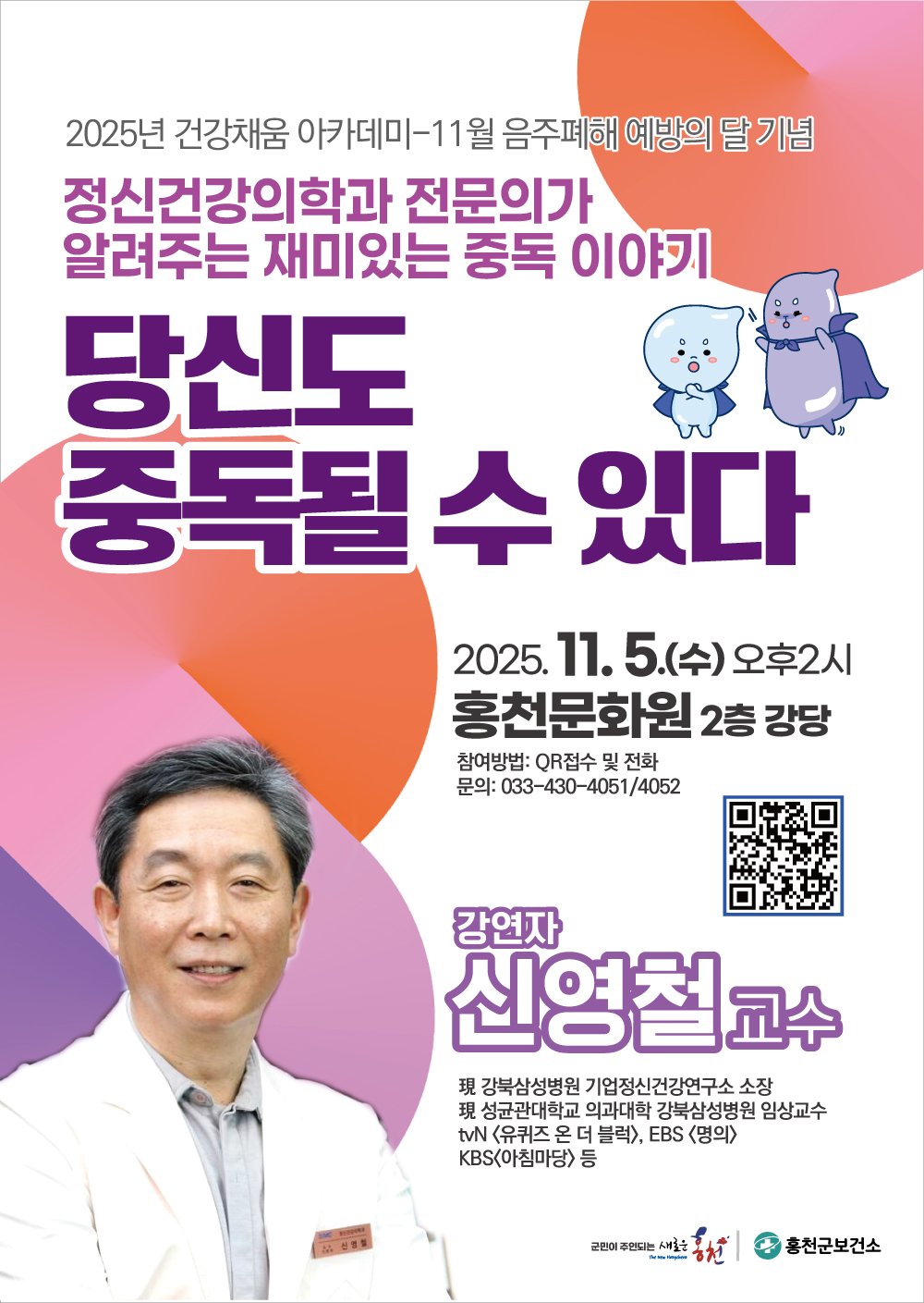 [아시아월드뉴스] 홍천군보건소는 11월 ‘음주 폐해 예방의 달’을 맞이해 오는 11월 5일(수) 오후 2시, 홍천문화원에서 ‘2025년 건강채움 아카데미 - 중독 예방을 위한 강연’을 개최한다.