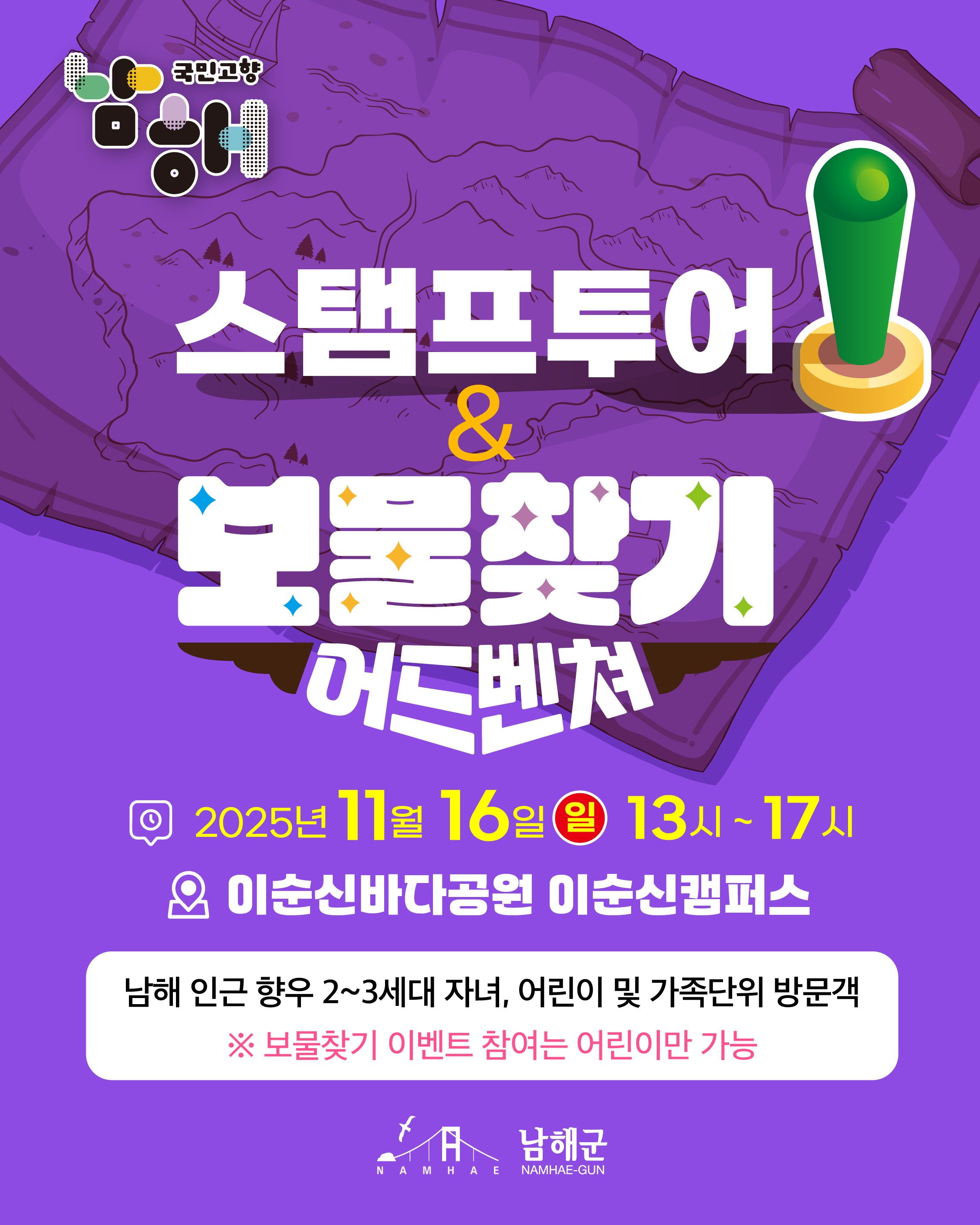 [아시아월드뉴스] 남해군은 ‘2025 고향사랑 방문의 해’를 맞아 오는 11월 16일 오후 1시부터 5시까지 이순신바다공원 이순신캠퍼스 일원에서 향우 자녀와 가족 단위 관광객을 위한 ‘국민고향 남해 스탬프 투어 & 보물찾기 어드벤처’를 개최한다.