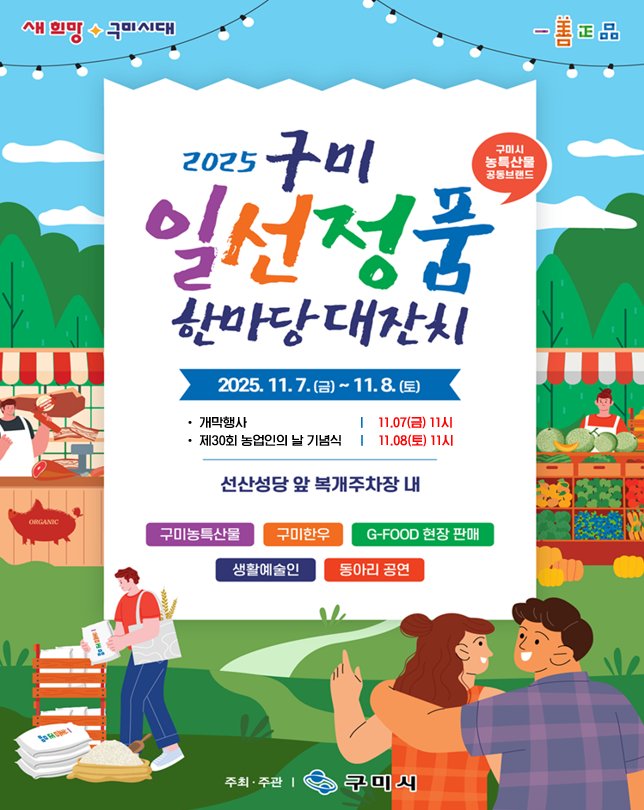 [아시아월드뉴스] 구미시는 11월 7일부터 8일까지 이틀간 선산읍 복개주차장 일원에서 ‘2025 구미 일선정품 한마당 대잔치’를 연다.